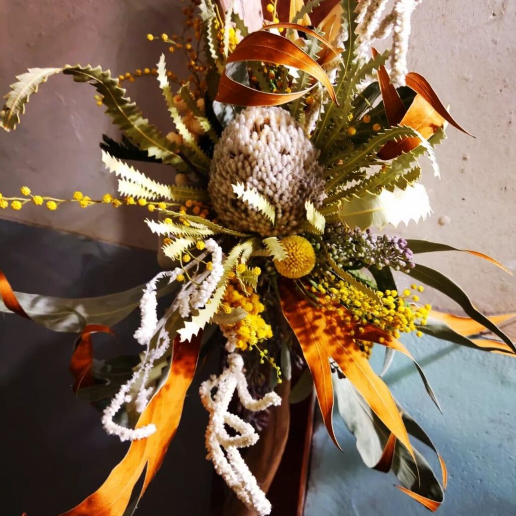 ニュアンスあふれるドライフラワーのスワッグ。