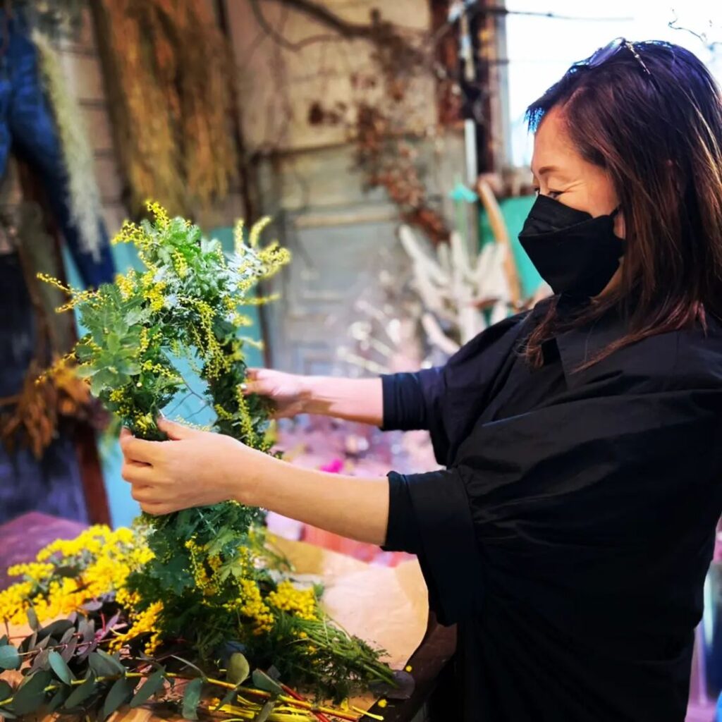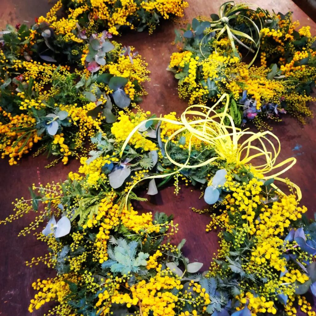 人それぞれでいろんな作り方があるリースですが、今回のフライングリースは、ただただミモザの木を丸くしただけのつくり方で進めていただきました。