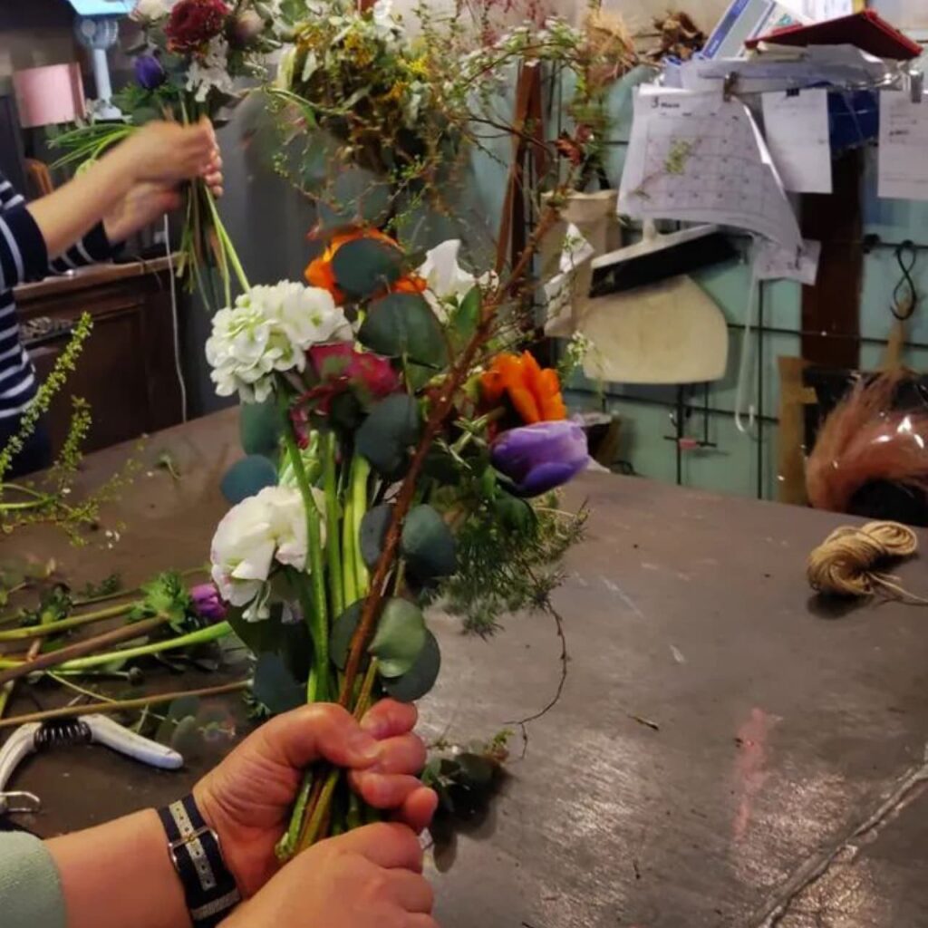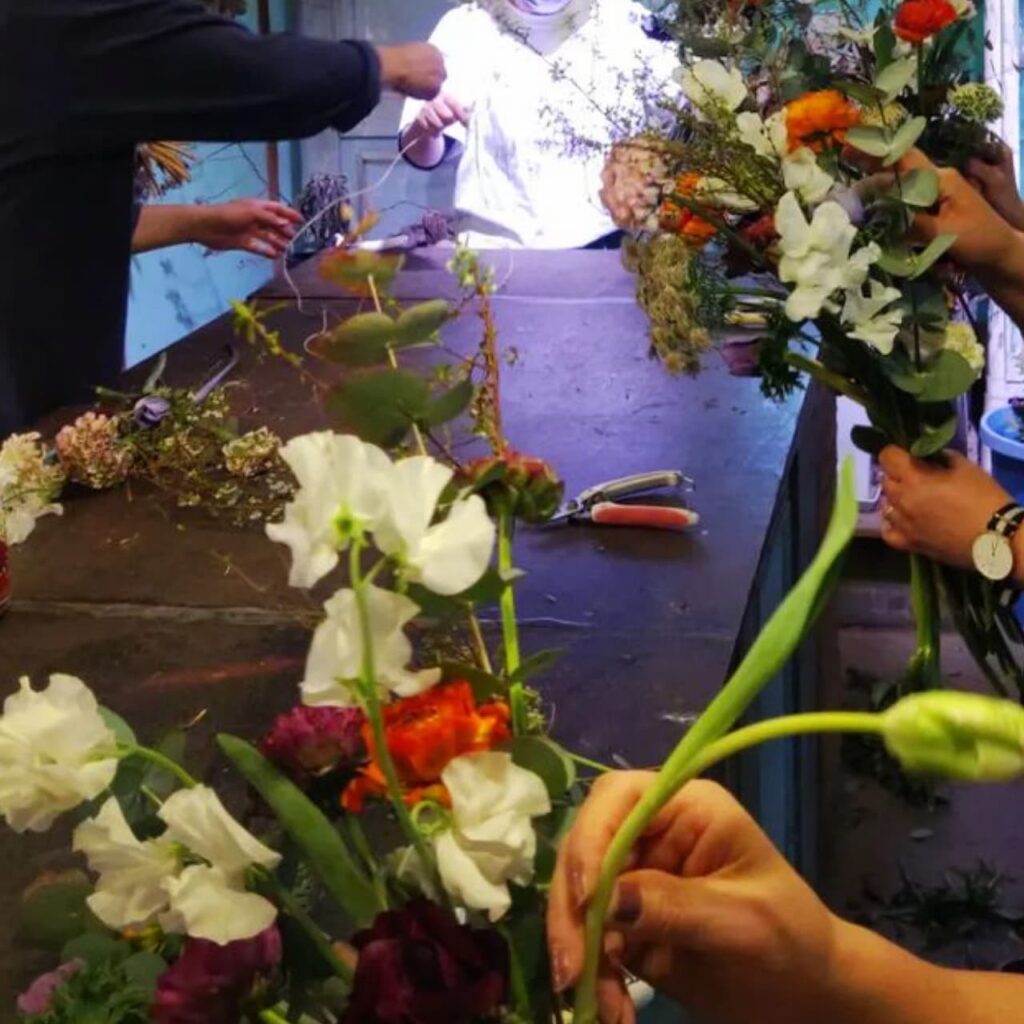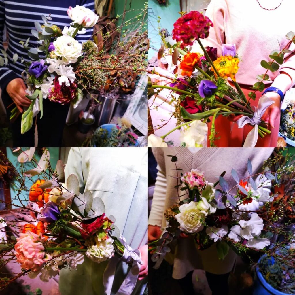 咲き方の違うお花をシャープに束ねていくので、慣れないため最初は戸惑いもありますが、みなさますぐにコツを掴まれて素敵に束ねておられます。