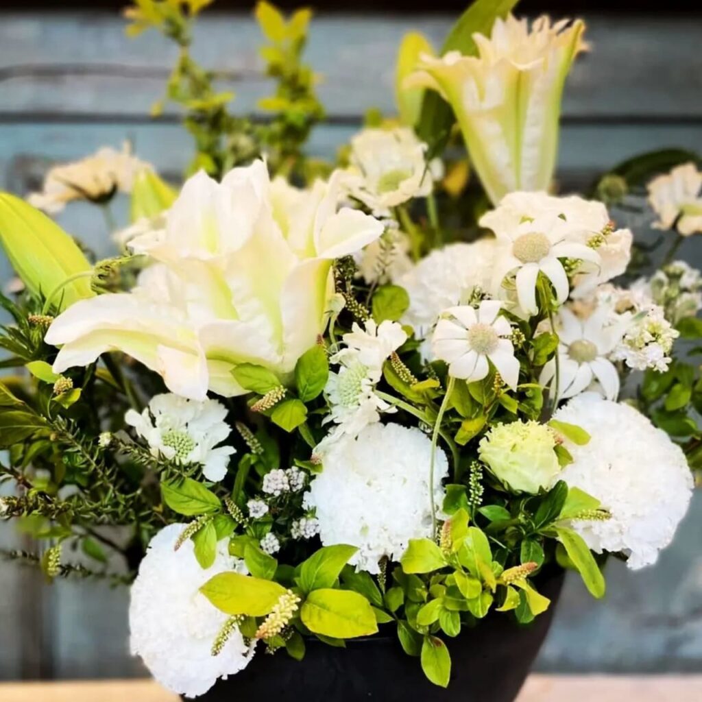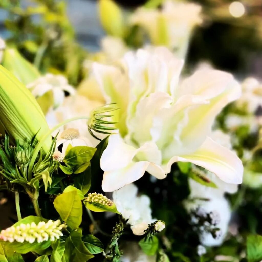 ホワイト&グリーンをベースに、挿し色や花材でシミズガーデンらしさが出るようなアレンジメントをお作りさせていただいています。