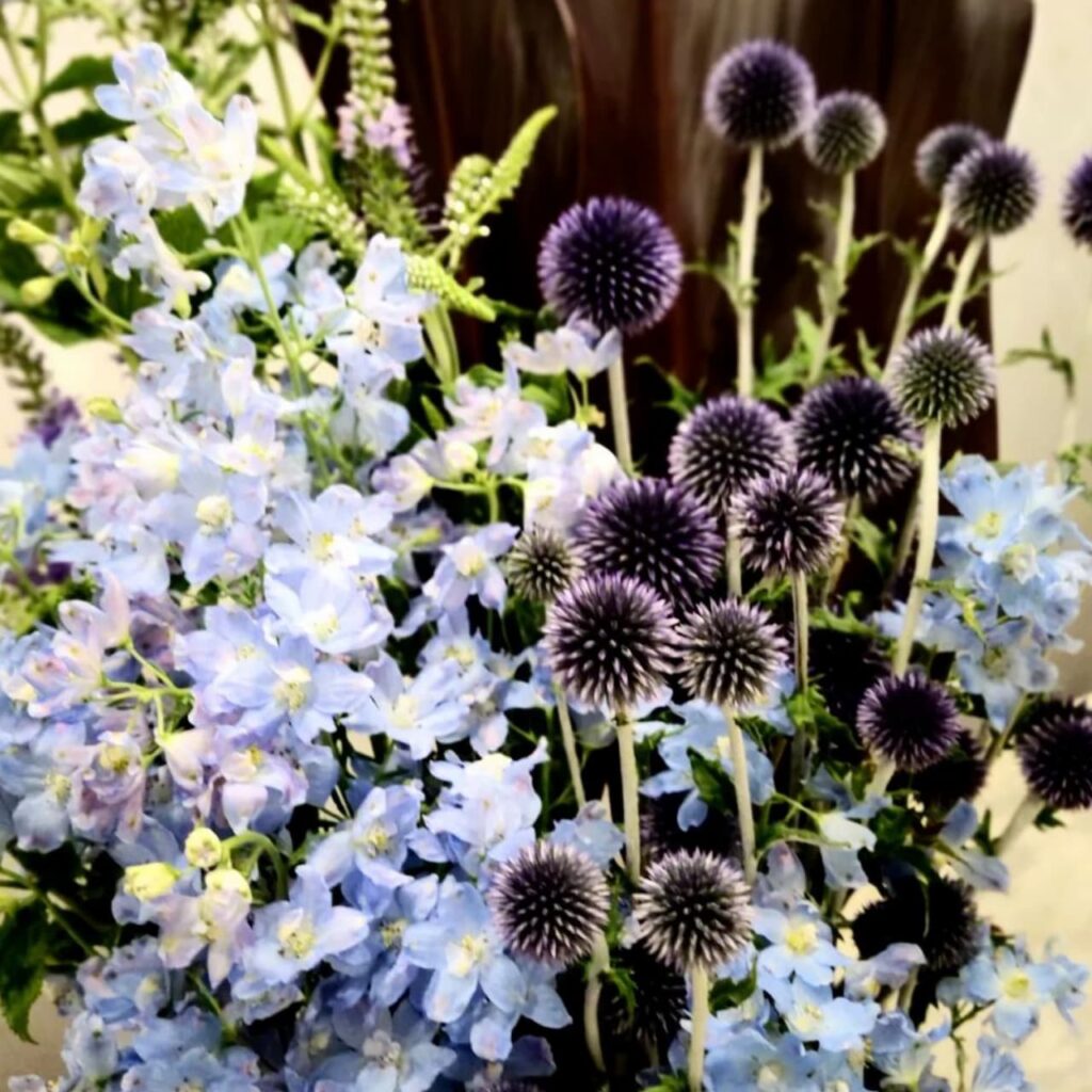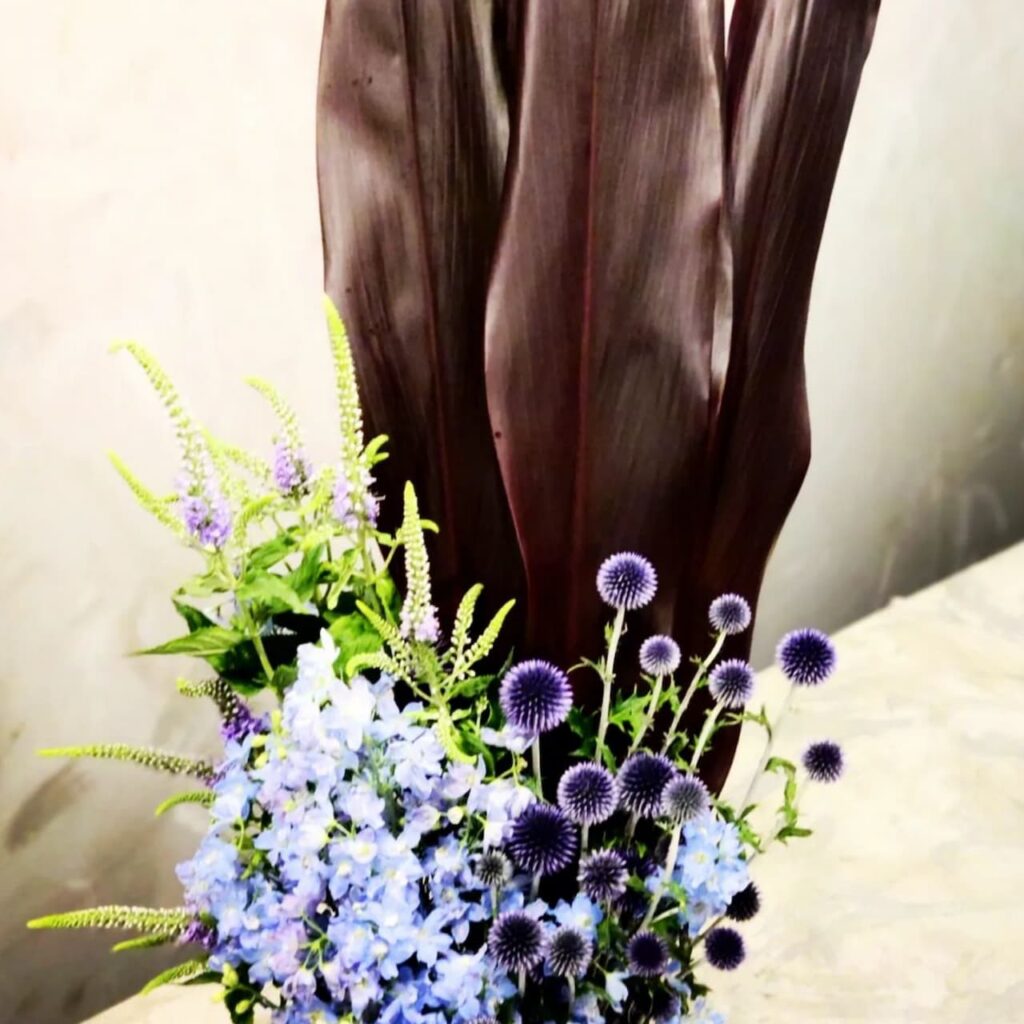 デルフィニウム、ベッチーズブルー(ルリタマアザミ)のブルーが映えるよう、背面にドラセナの葉を仕込んであります。