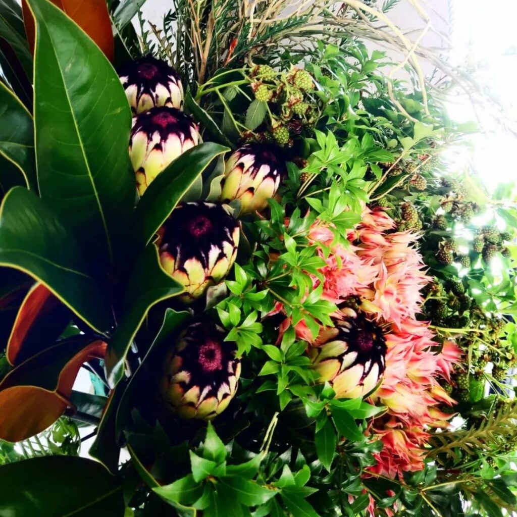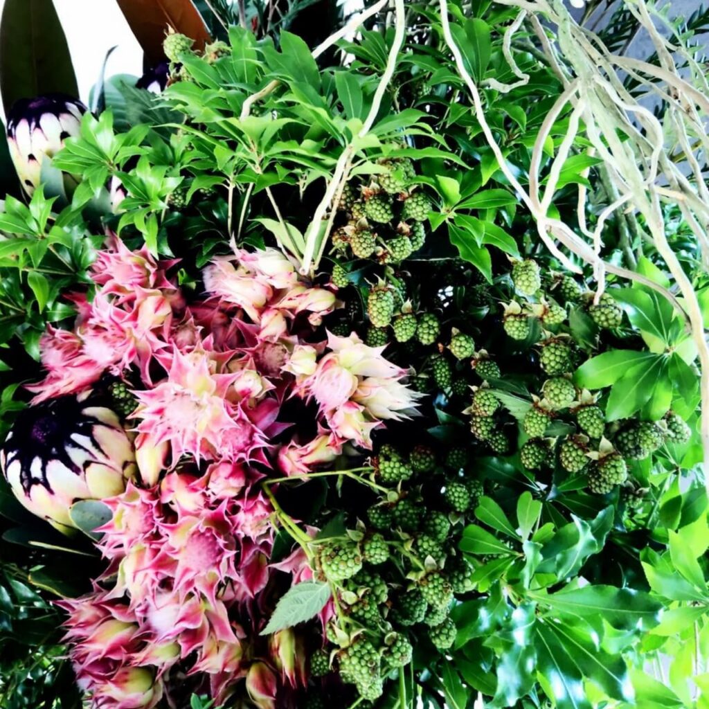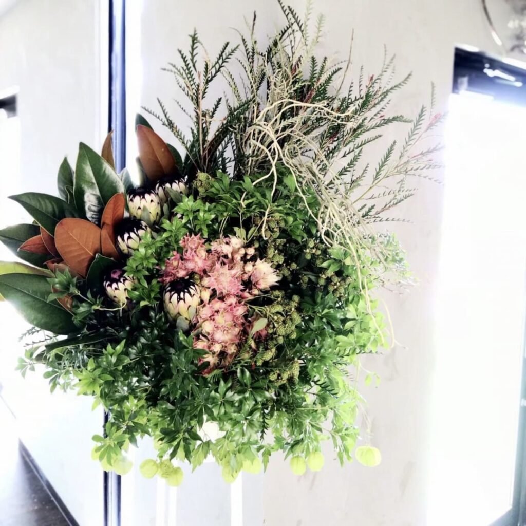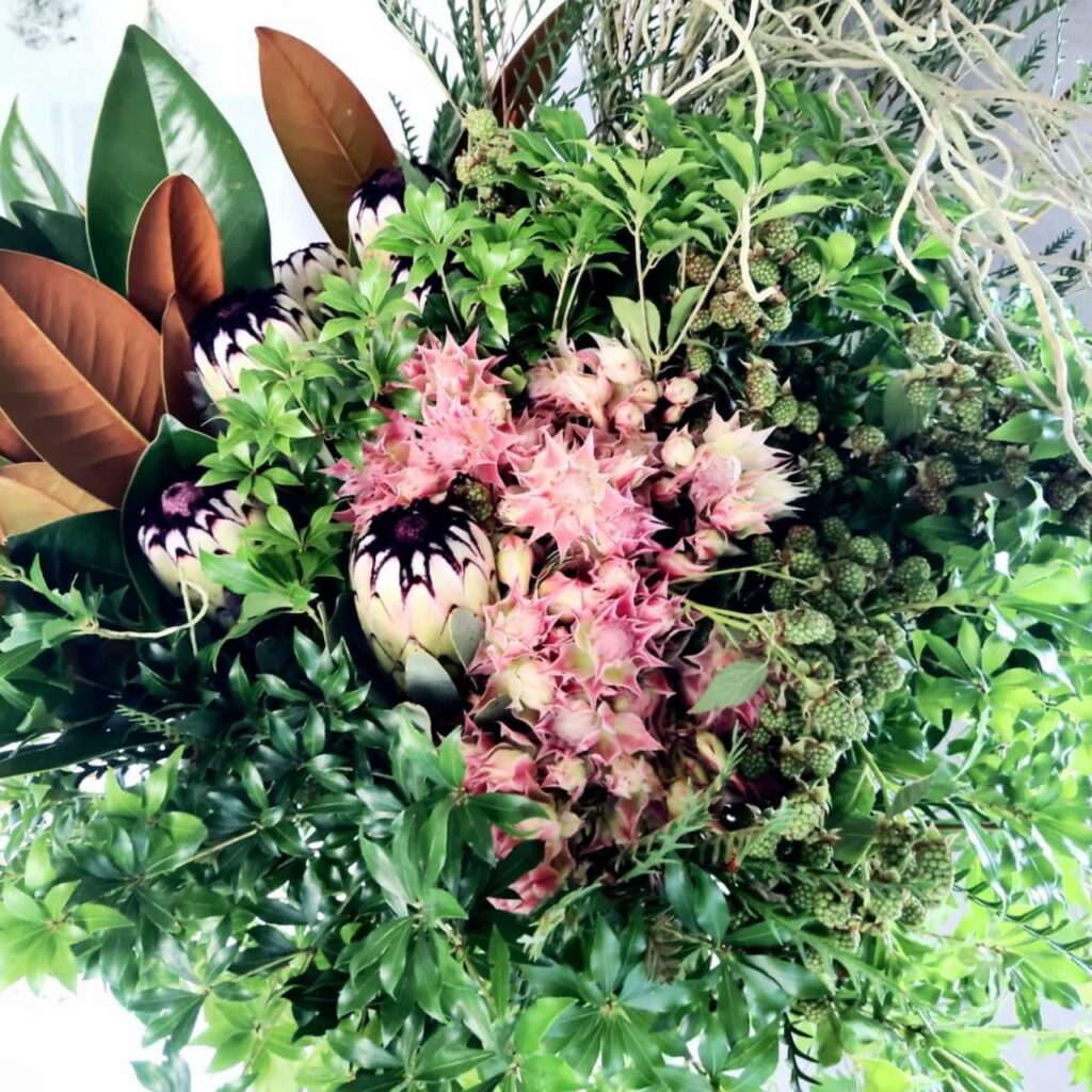 暑い季節でも少しでも持ちがいいよう、ワイルドフラワーのプロテアニオベやセルリアをメインに、爽やかで華やかに仕上げました。