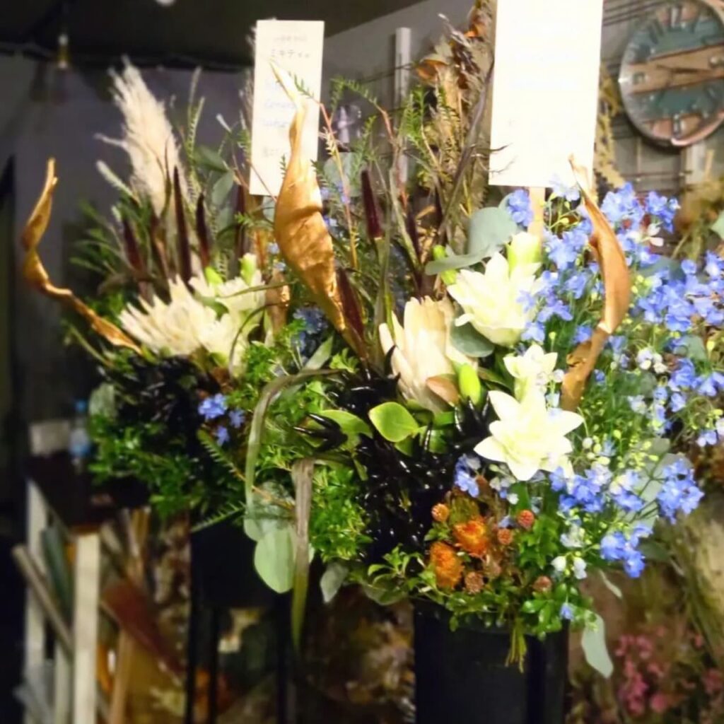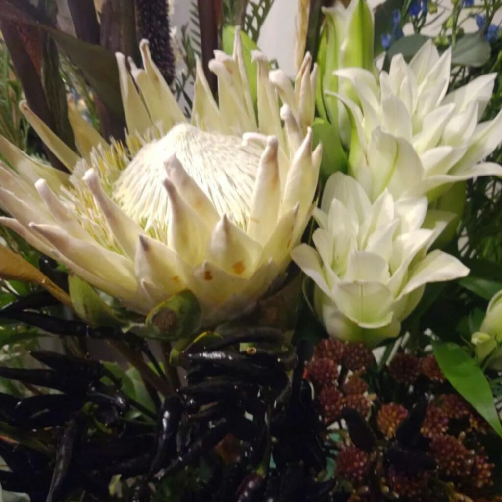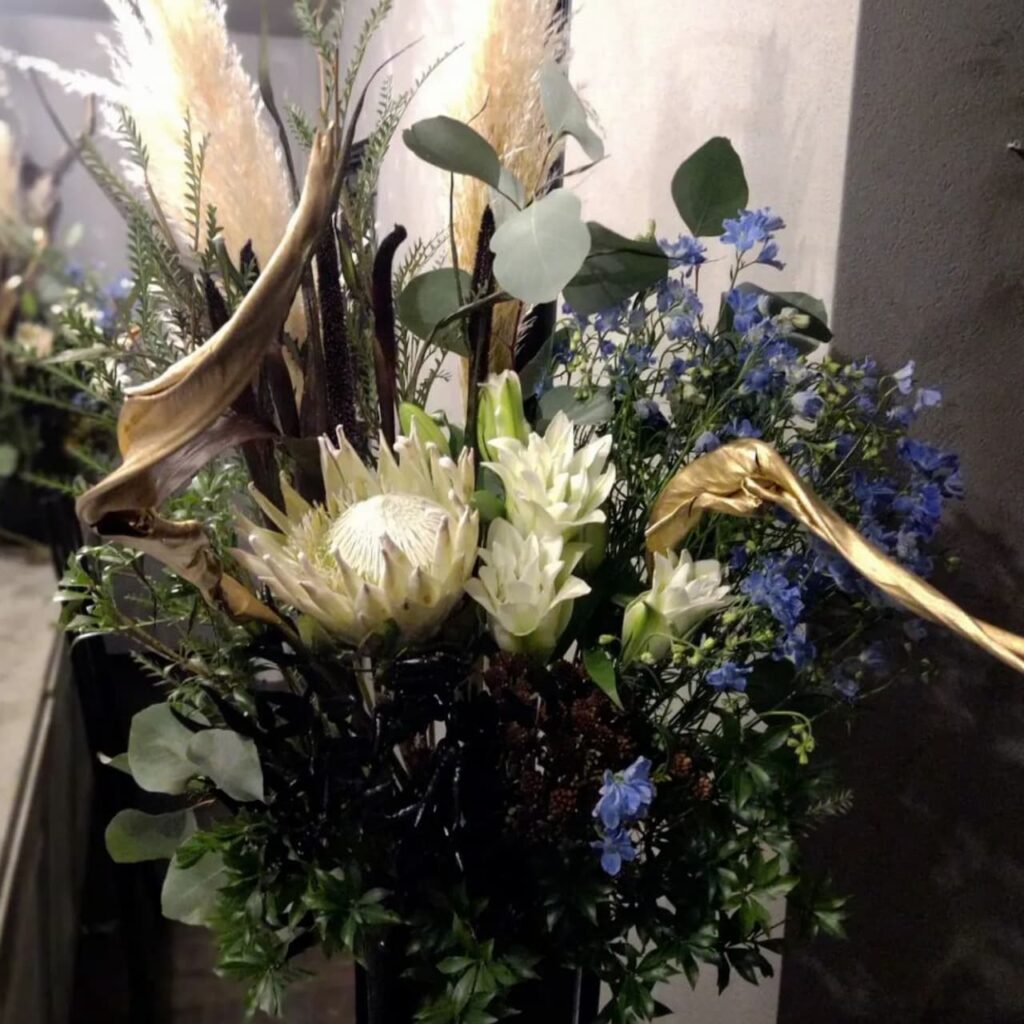 プロテアや八重ユリなど、個性あふれるお花たちが華やかで存在感もたっぷりです。