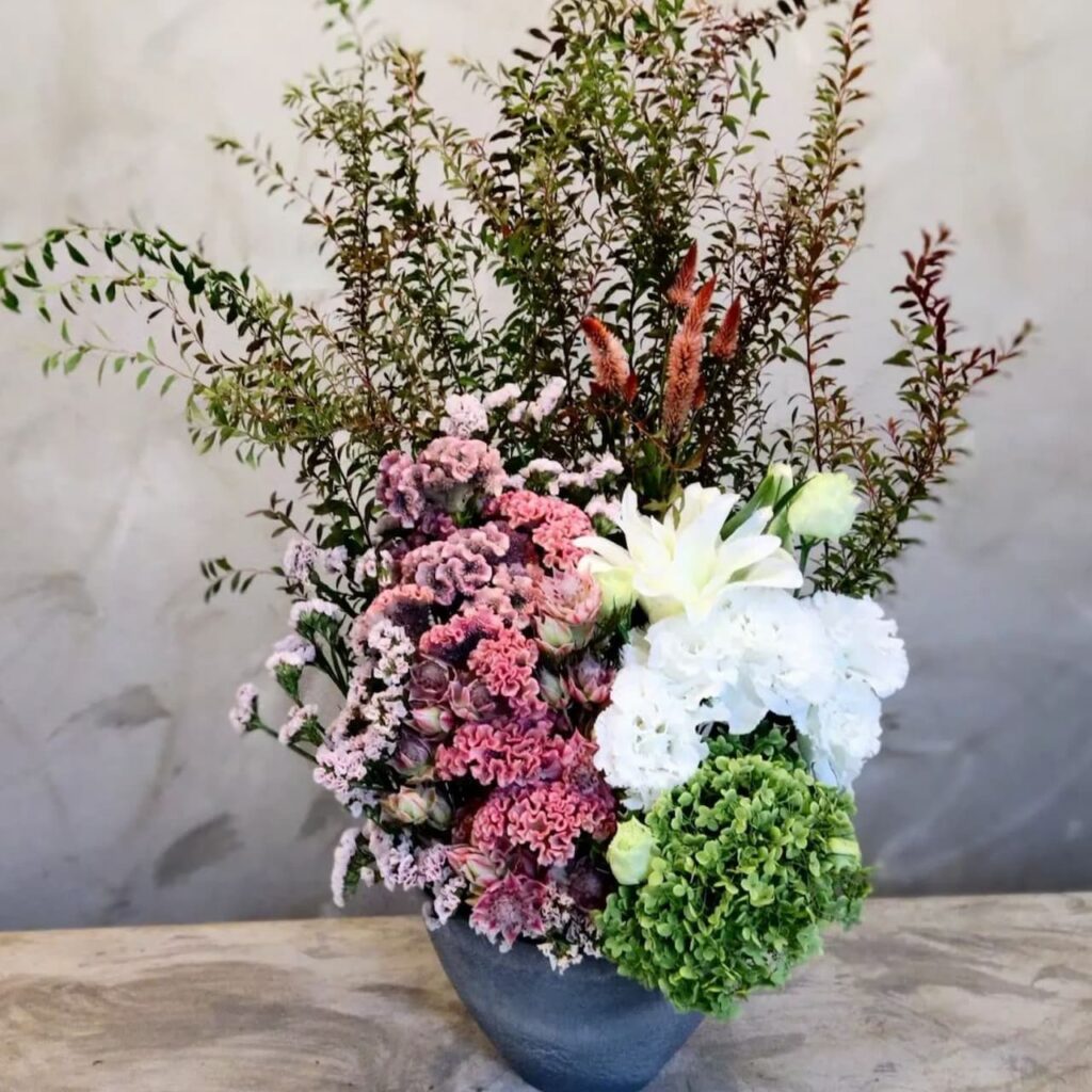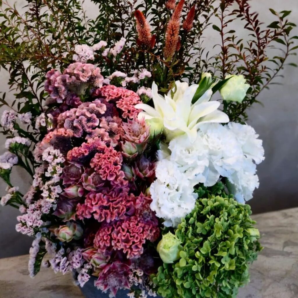 白花のアレンジメントはもちろん、故人様のお好きだったお花、季節のお花を合わせて、などご要望にお応えしておつくりいたします。