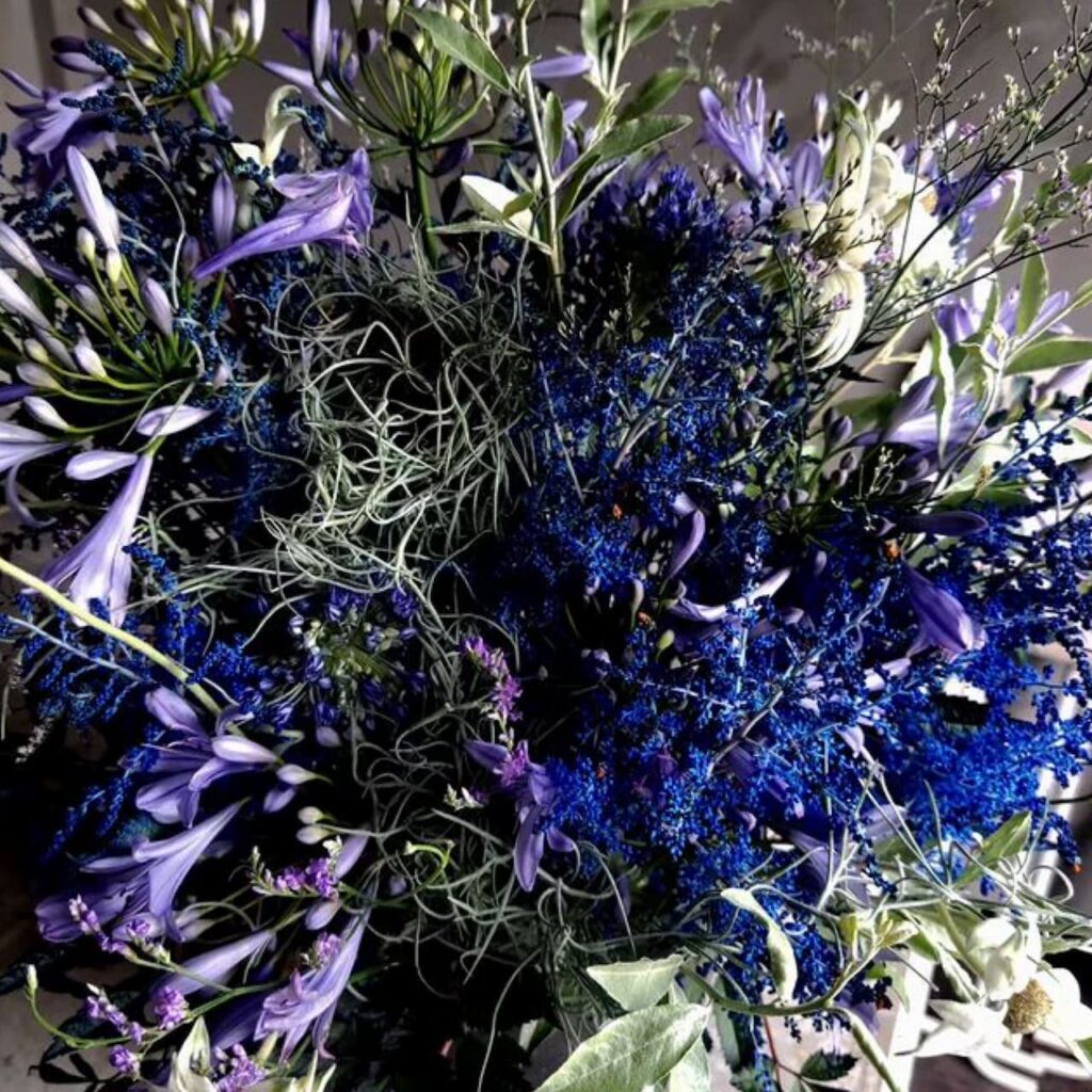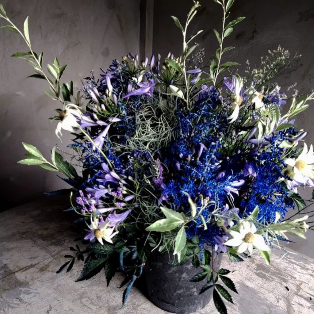 オーストラリア原産のワイルドフラワーのフランネルフラワーや、染めたアスチルベなど、ブルーやパープルのカラートーンでクールなアレンジメントになっています。