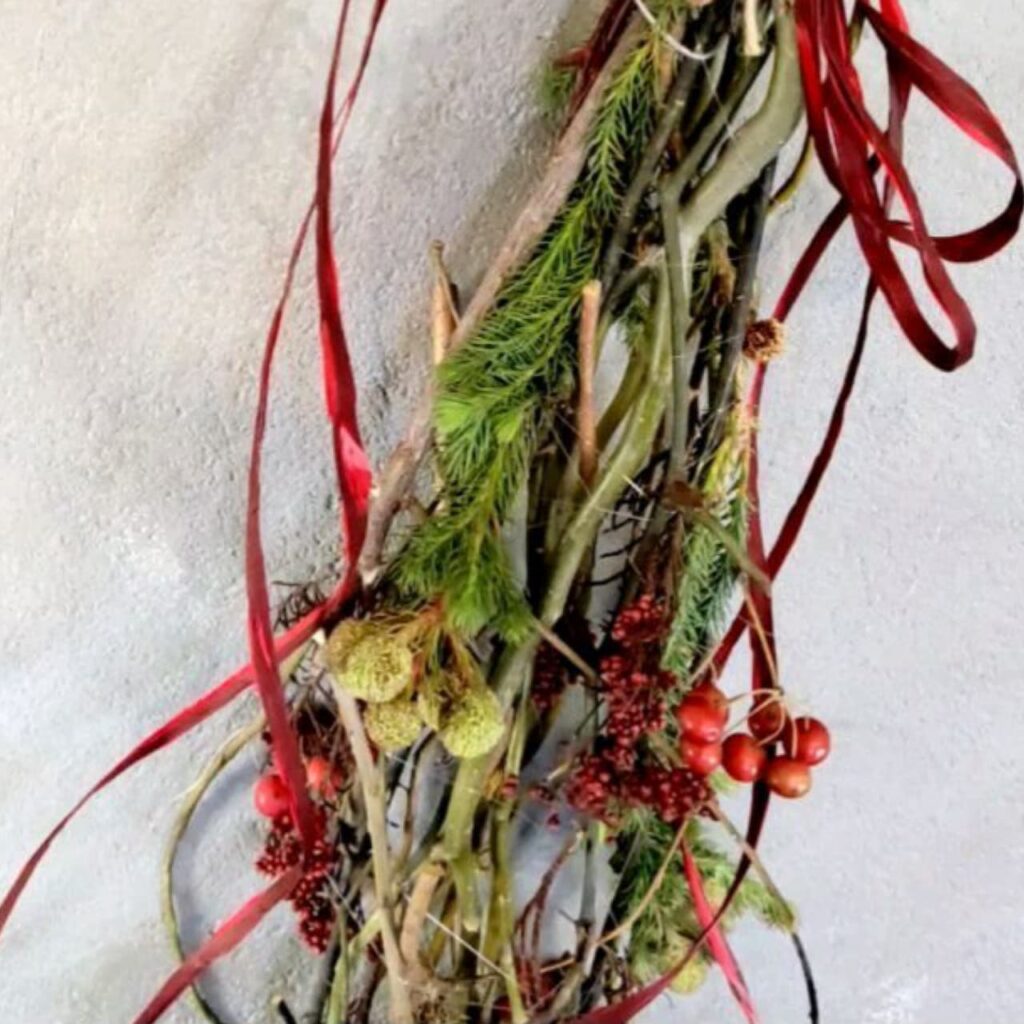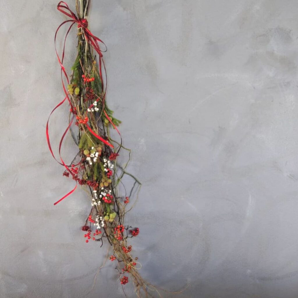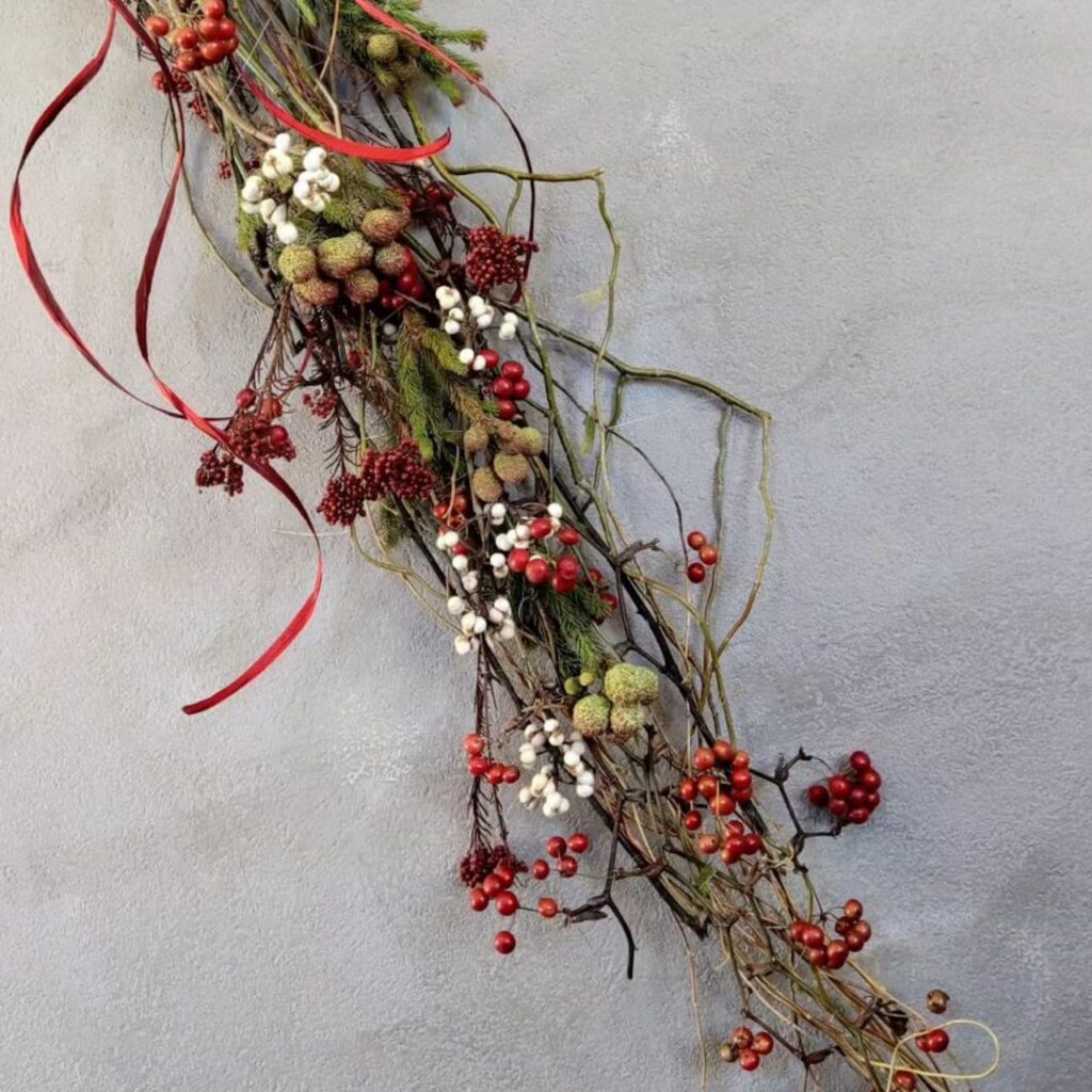 枝ものと実ものを合わせてシンプルながらも個性的な和モダンなロングスワッグに仕上げました😄