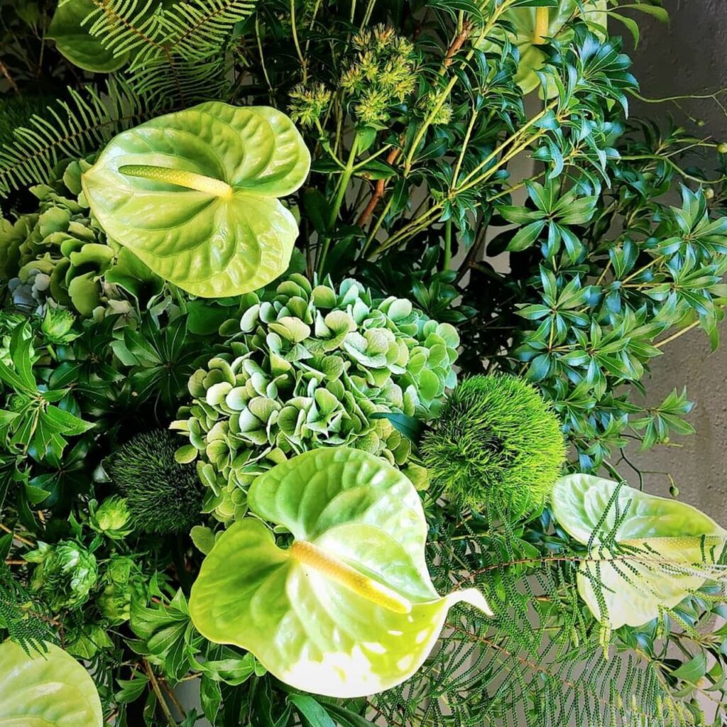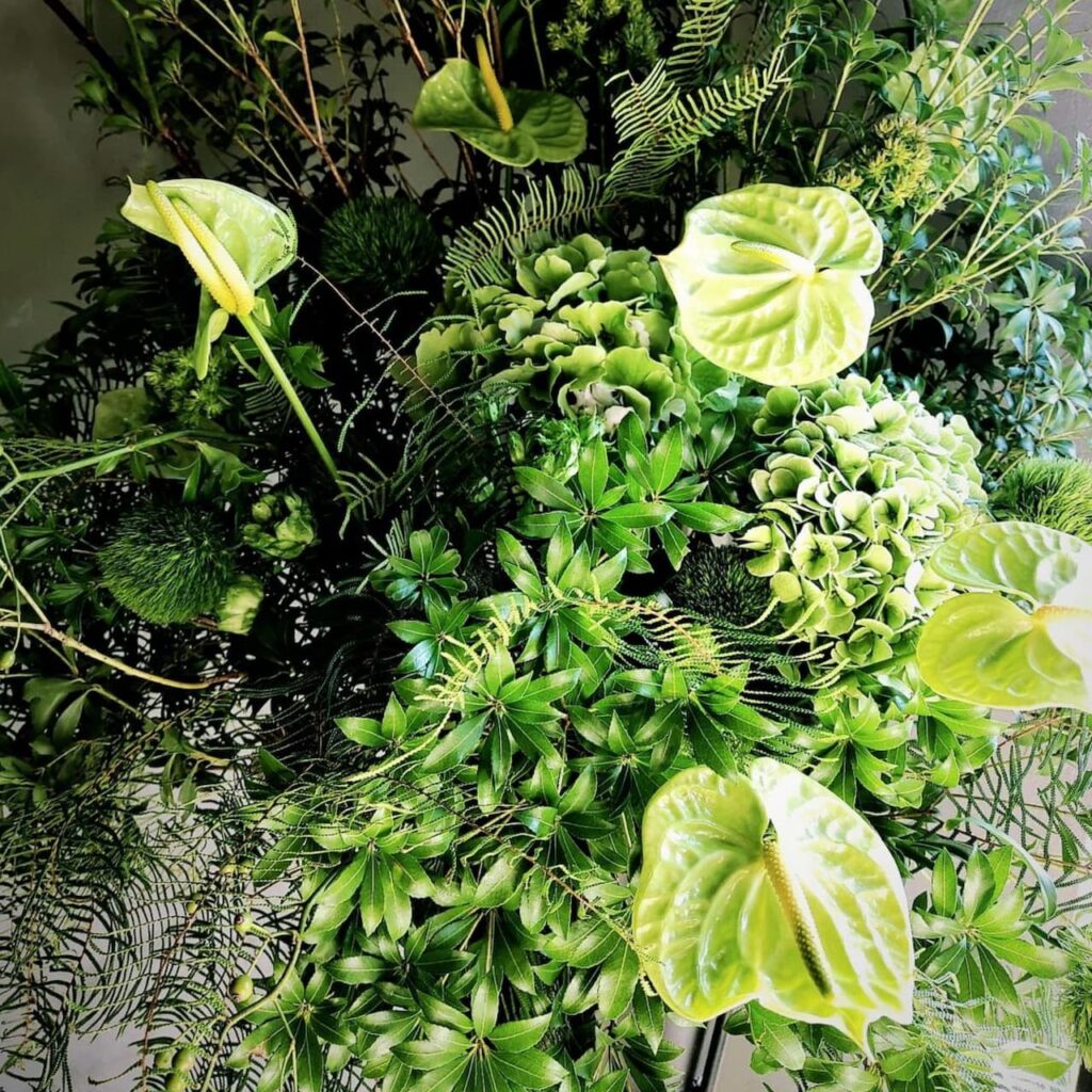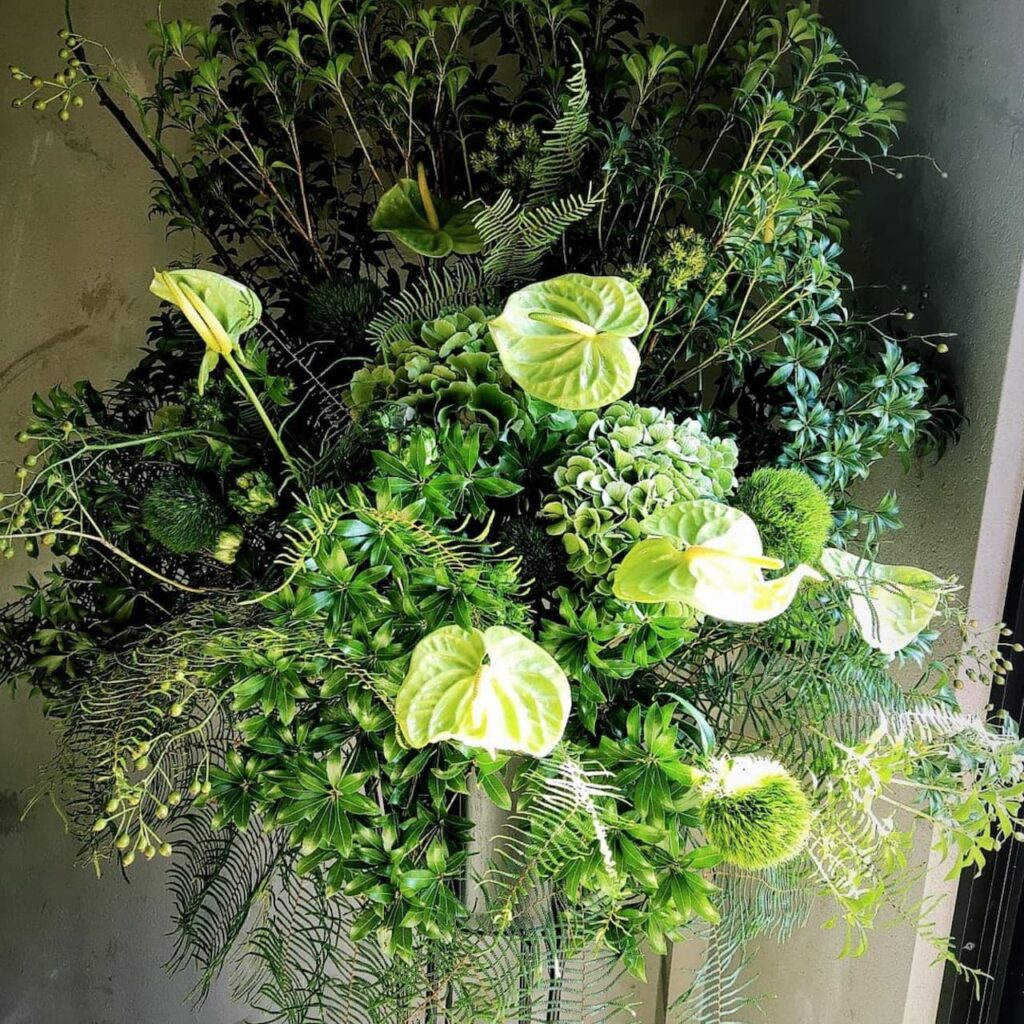 グリーンのワントーンでも森になりすぎず、お花の華やかさも残しつつインパクトのあるもので作らせてもらいました!