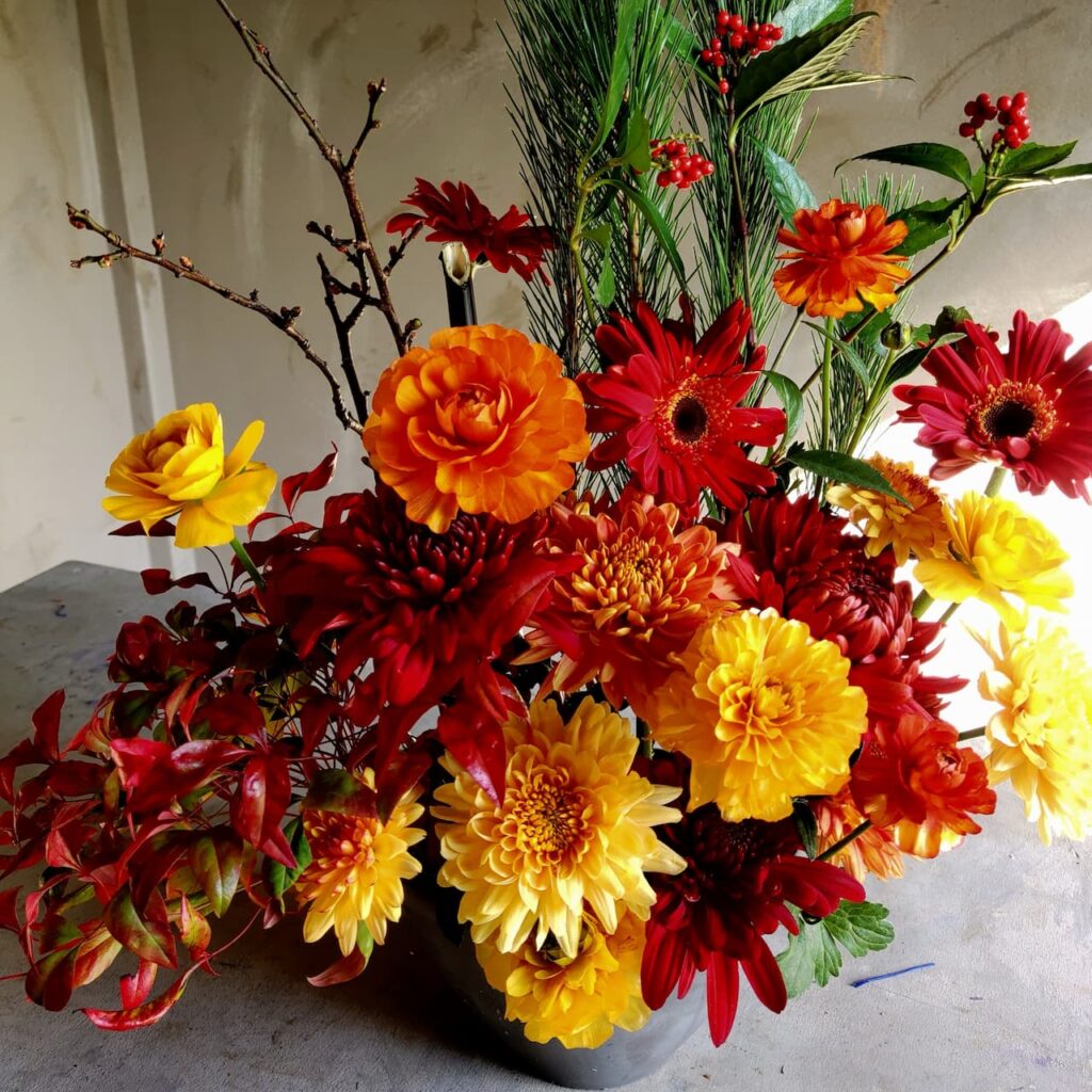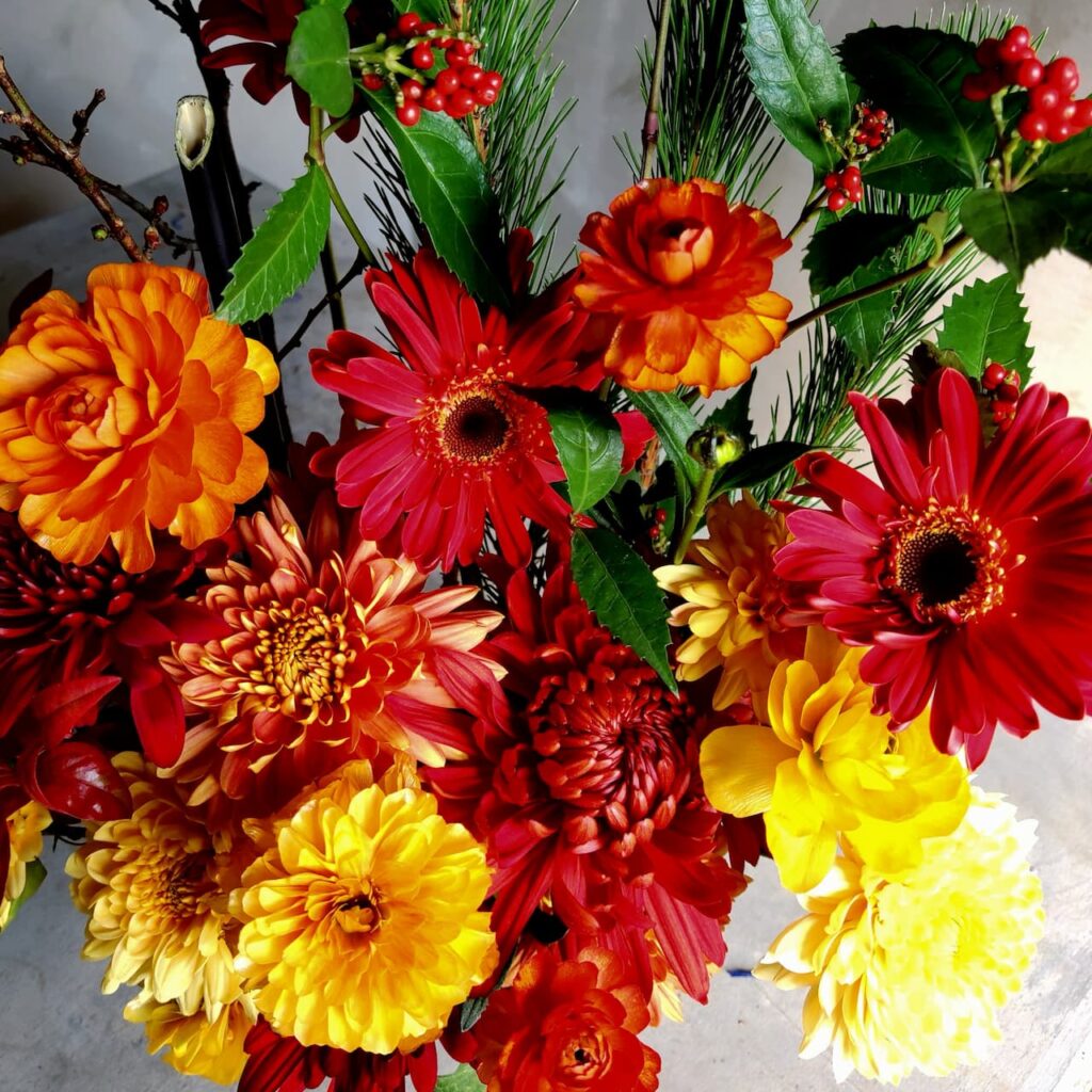 2025年、和洋折衷のおしゃれなアレンジメントで迎えるお正月。 shimizu gardenの迎春花は、松竹梅、千両のような従来のお正月花に、 自家栽培の大輪マムやガーベラ、季節の洋花も組み合わせた、縁起よくおしゃれなお花です。 和風、洋風どちらのしつらえにも寄り添うよう仕上げました。 アレンジメントのため、そのまま飾っていただく…
