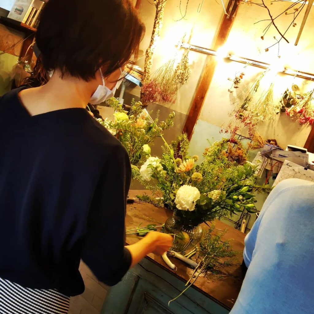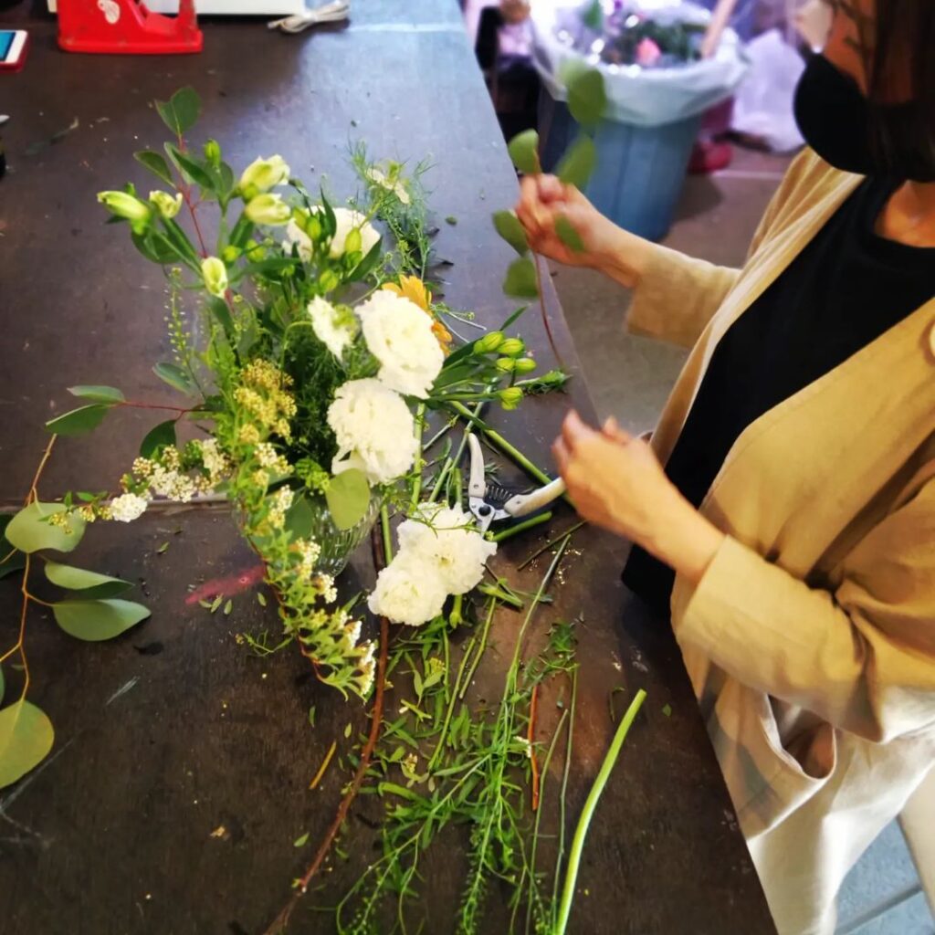 束ねるわけでもなく、吸水スポンジを使うわけでもないため、安定しないお花をどうやって投げ入れていくかを体験していただきました。
