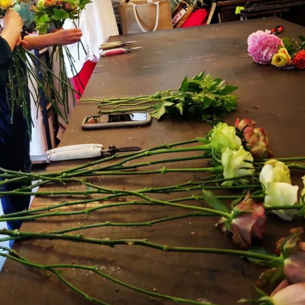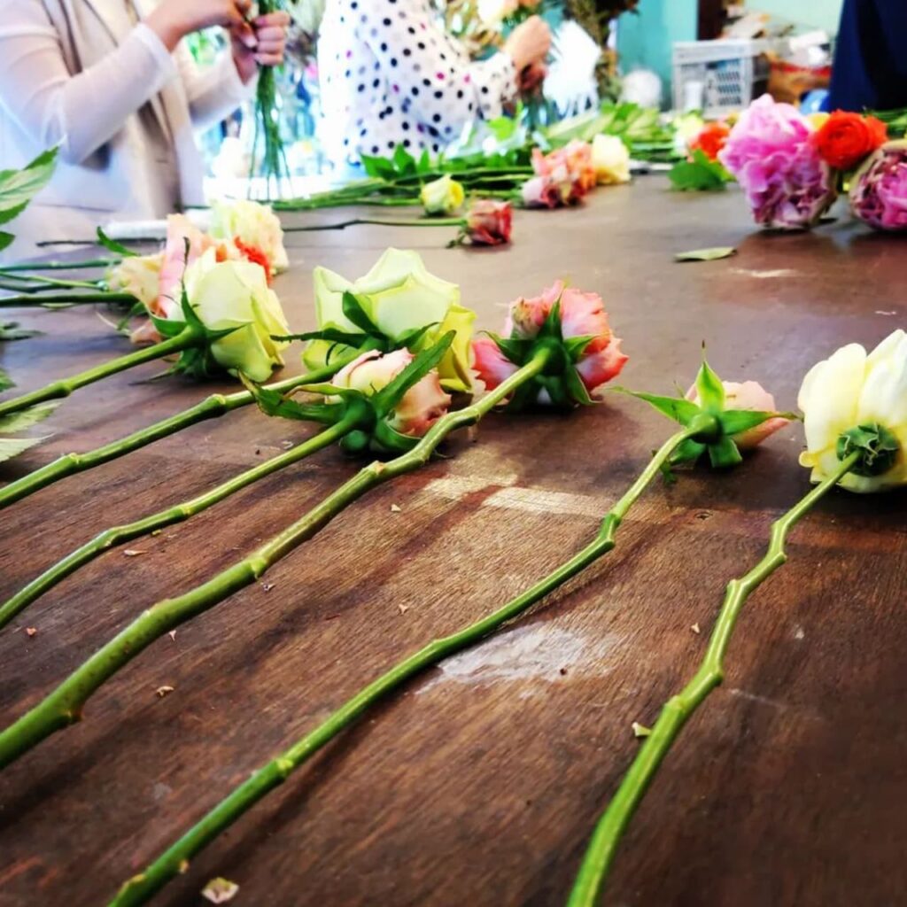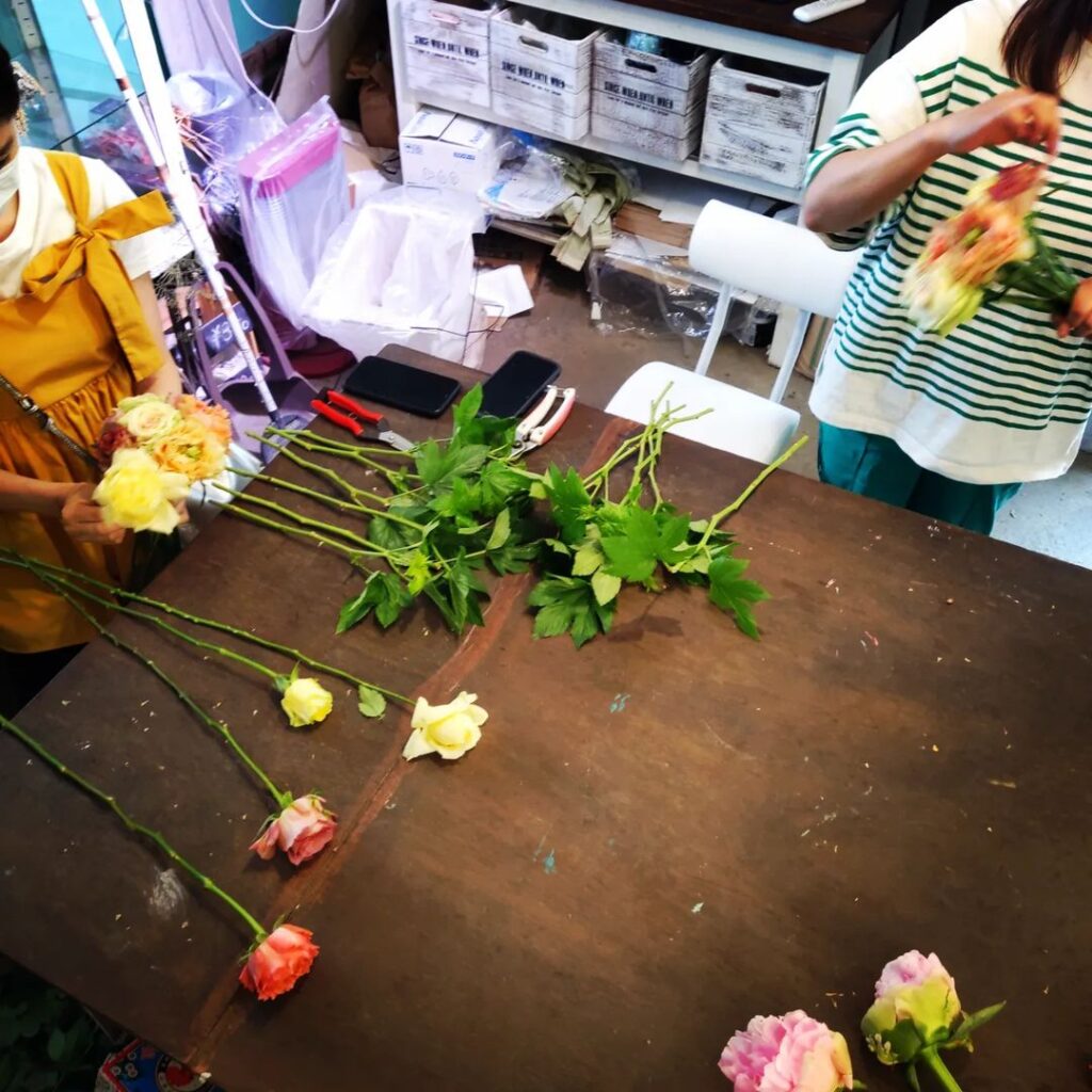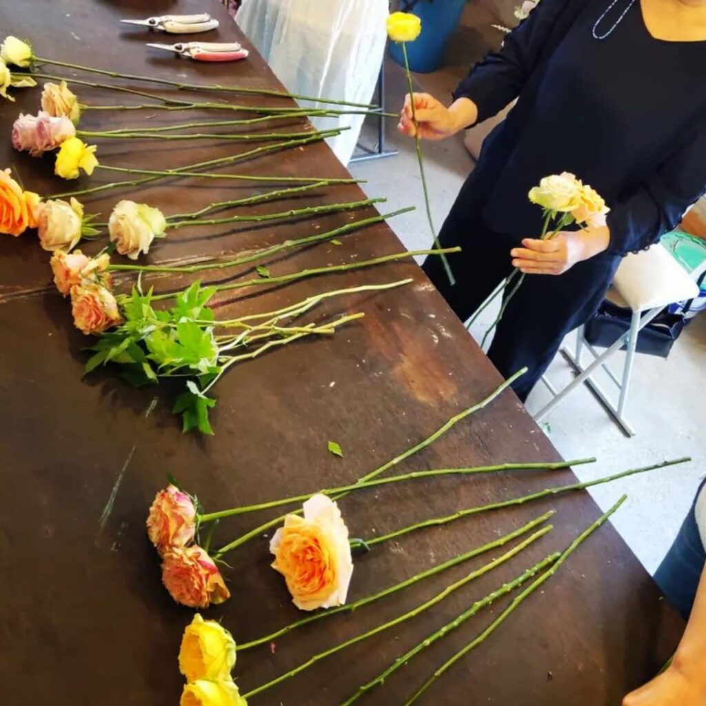 5月のシミズガーデンのフラワーレッスンは、マスフラワーであるバラのブーケを束ねていただきました!