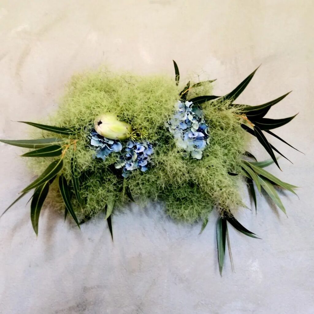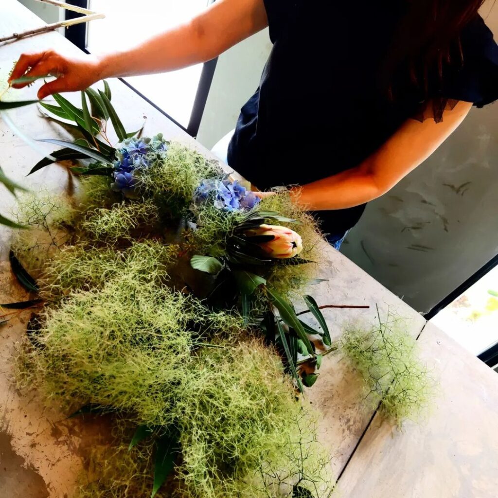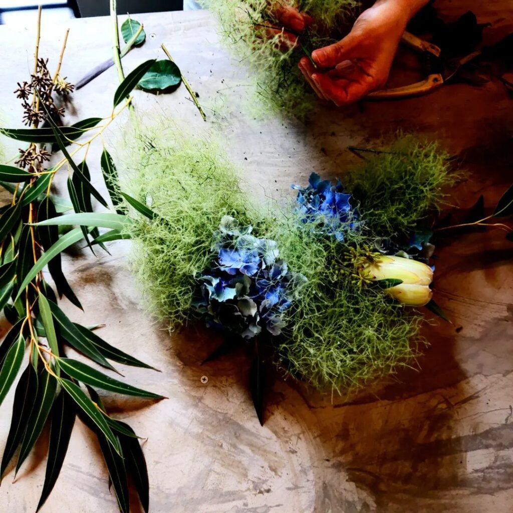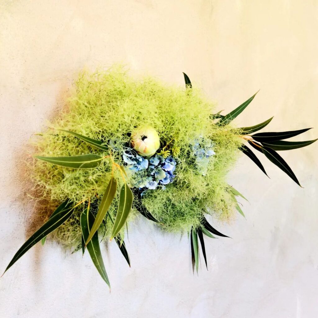 シミズガーデンコースは、トータルガーデンコースより、さらに発展的でクリエイティヴなクラスとなっており、メインのスモークツリーにアジサイをプラスした壁掛けオブジェを作っていただきました。