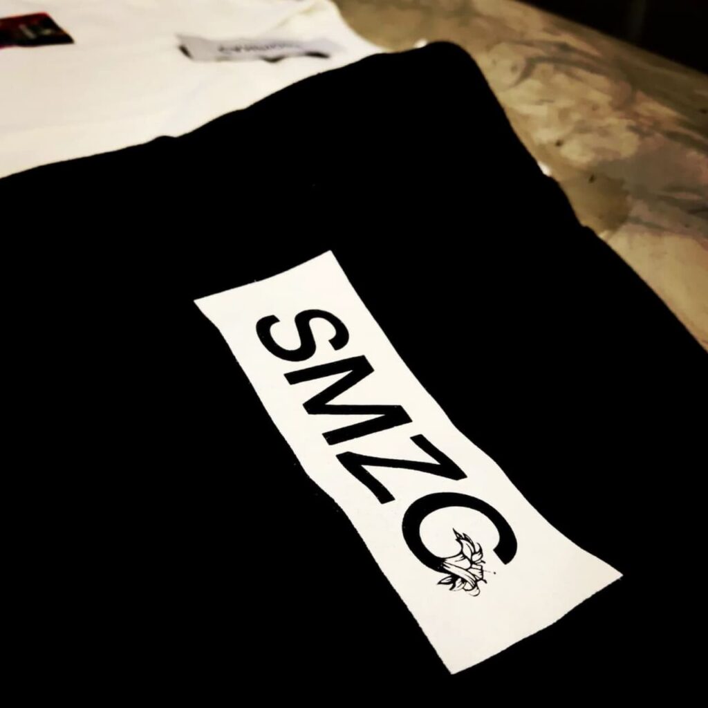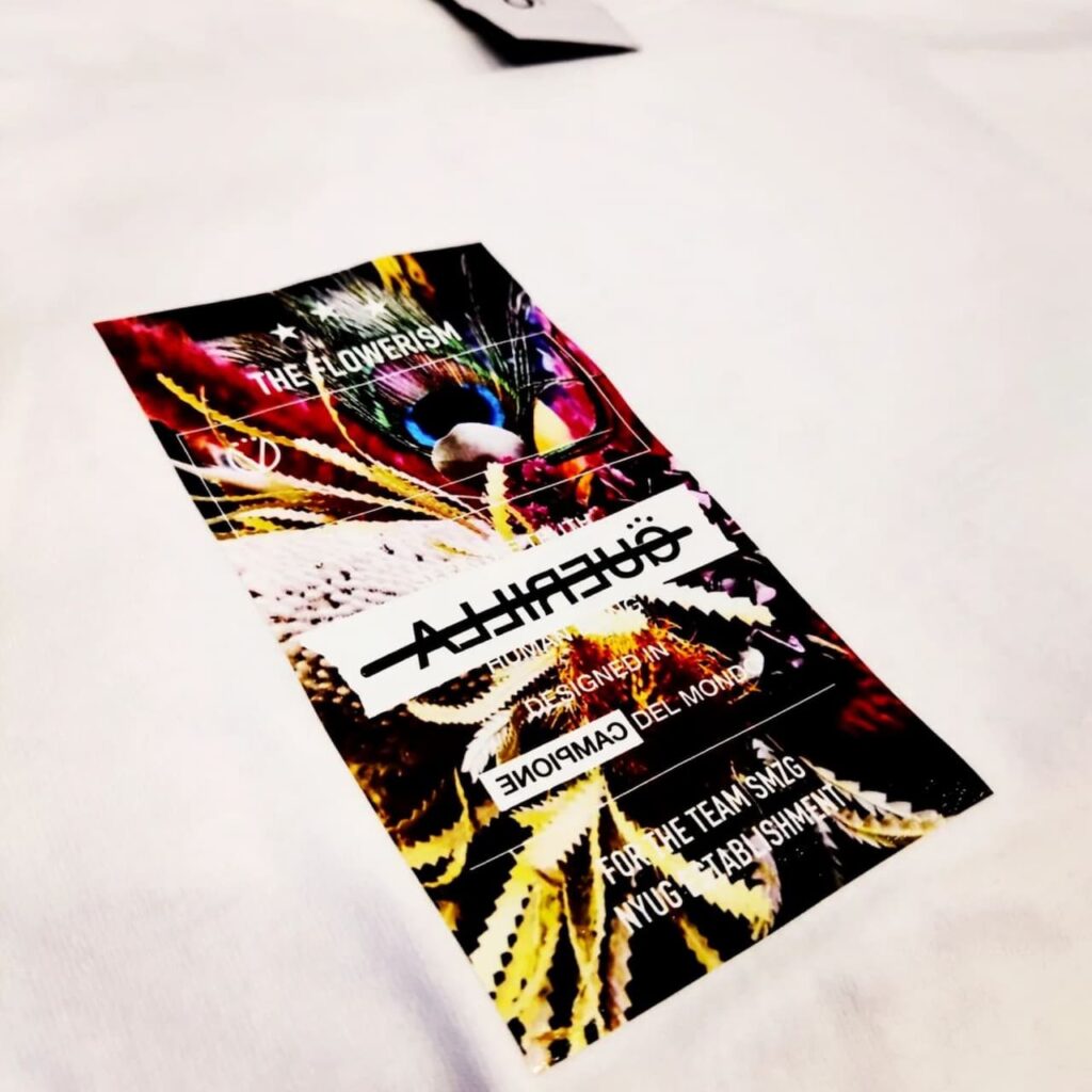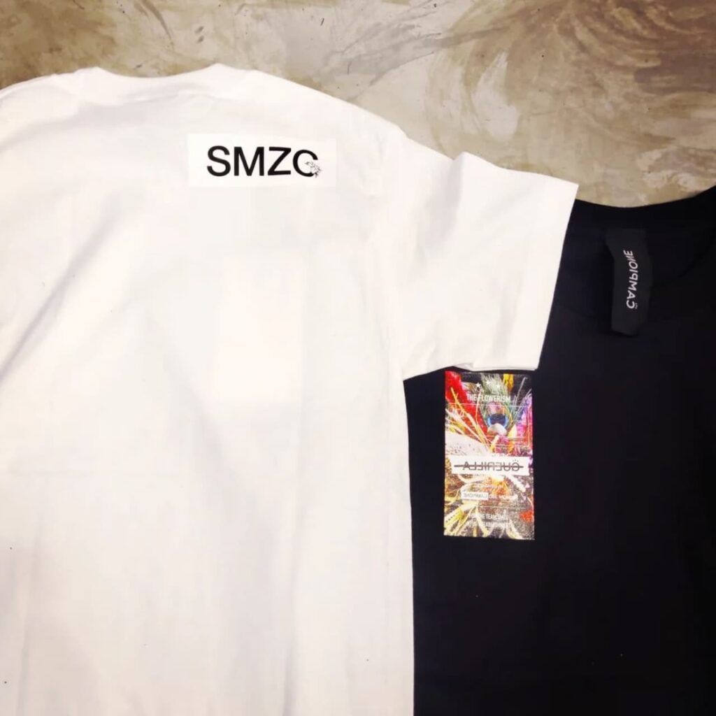 シミズガーデンのお花を使ったオリジナルプリントに、右後ろに「SMZG」のロゴ入りのTシャツ。