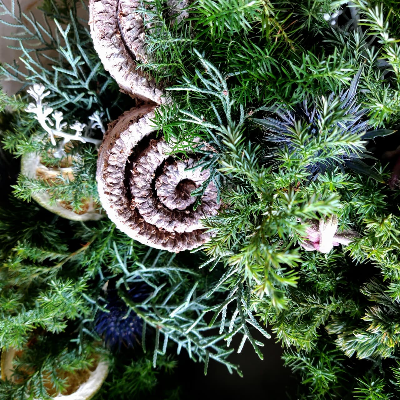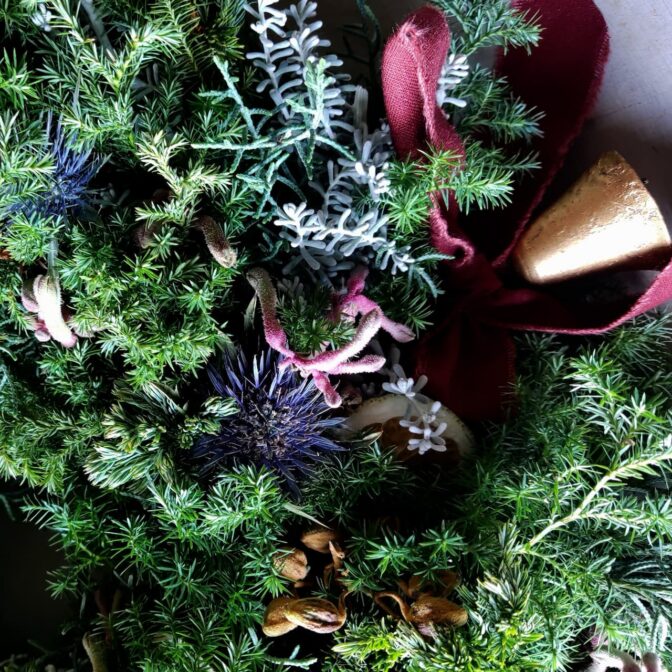 数種類の針葉樹に花材を合わせたナチュラルでおしゃれなリースです。