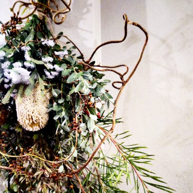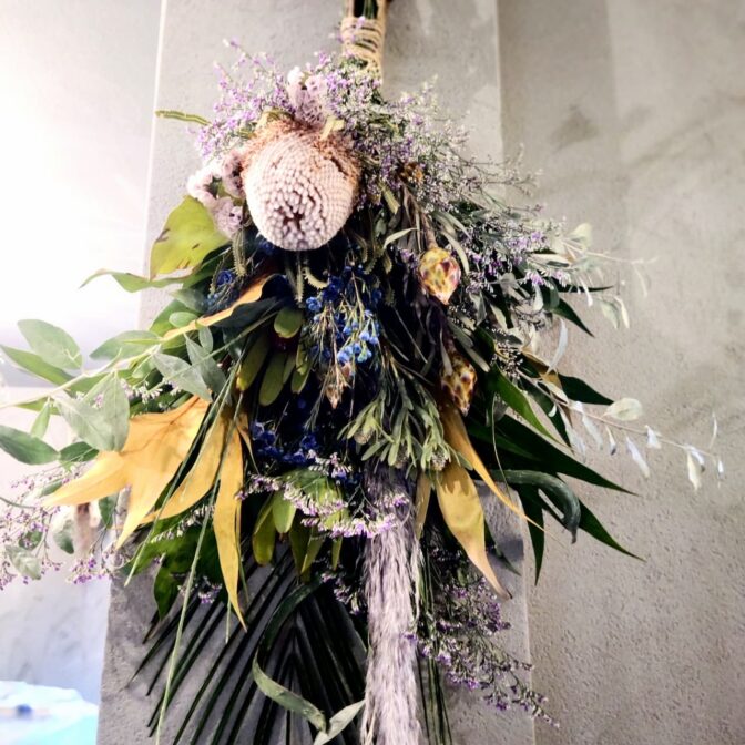 おしゃれなフラワーインテリア、ワイルドフラワーや流木を取り入れたドライフラワーアレンジメントやスワッグをご提供しています。