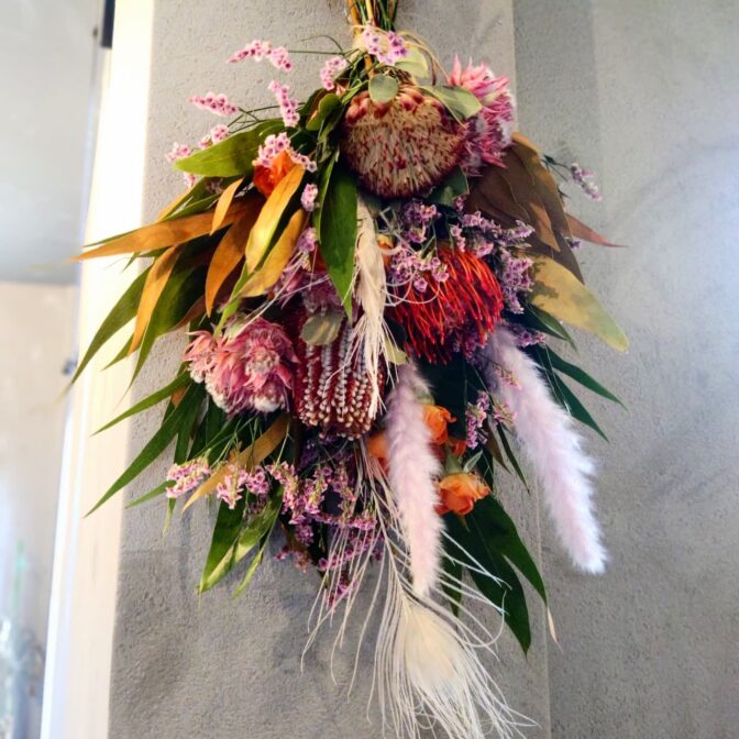 おしゃれなフラワーインテリア、ワイルドフラワーや流木を取り入れたドライフラワーアレンジメントやスワッグをご提供しています。