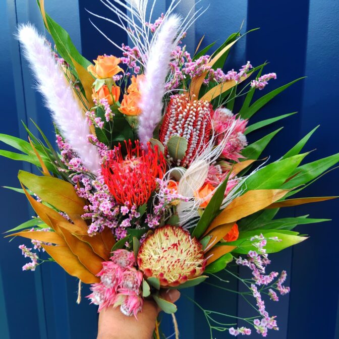 フレッシュな頃はもちろん、ドライになってからも色が残るような花材をセレクトして束ねます。