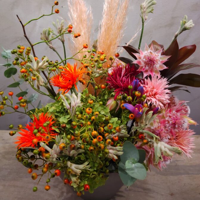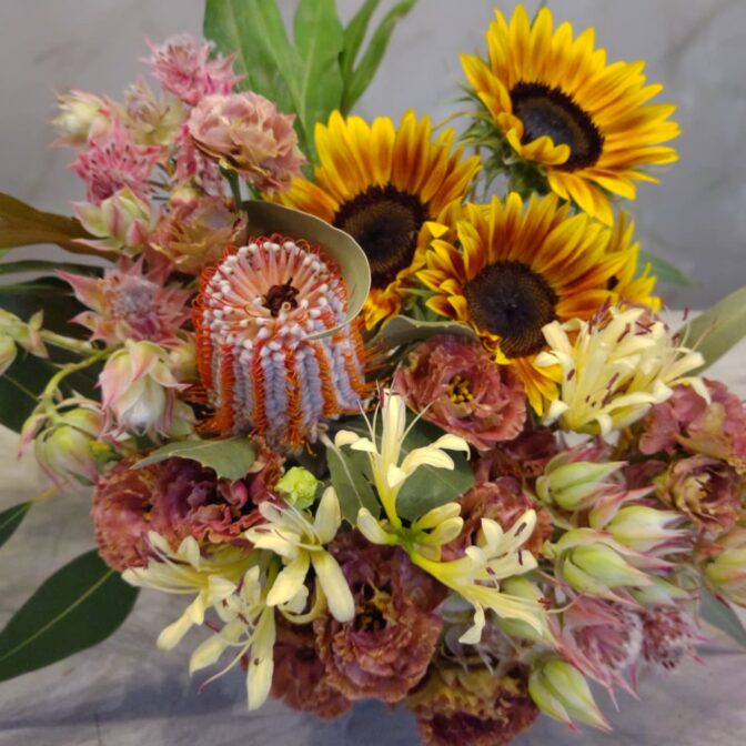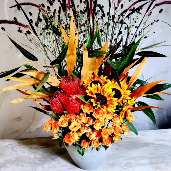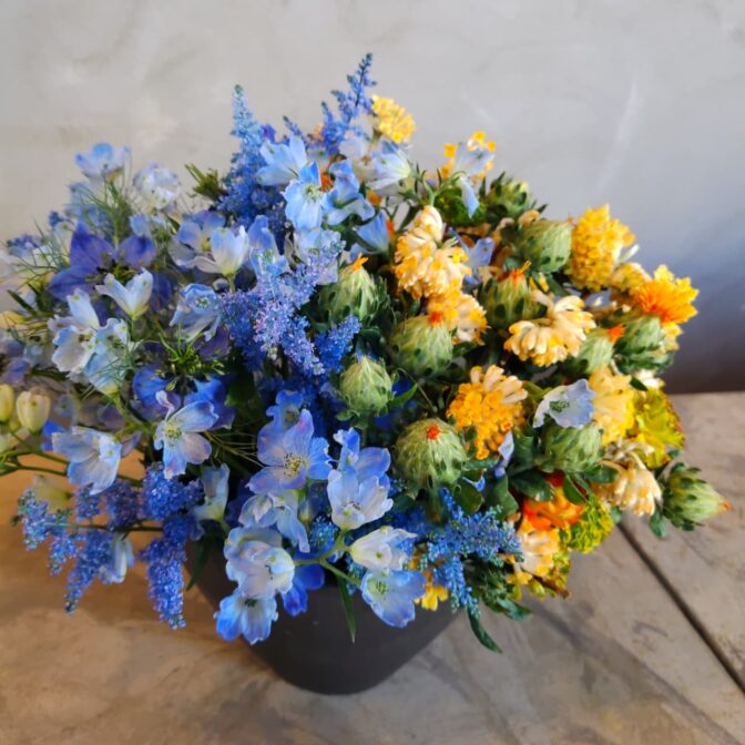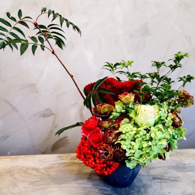 shimizu gardenのフレッシュなアレンジメント dramatic(ドラマティック)は、自家農園栽培ならではの新鮮な花々をはじめ、季節の花材を集めたおしゃれな仕上がり。