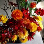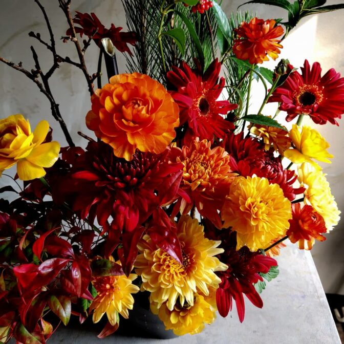 自家栽培のカラーやガーベラ、季節の洋花も組み合わせた、縁起よくおしゃれなお花です。
