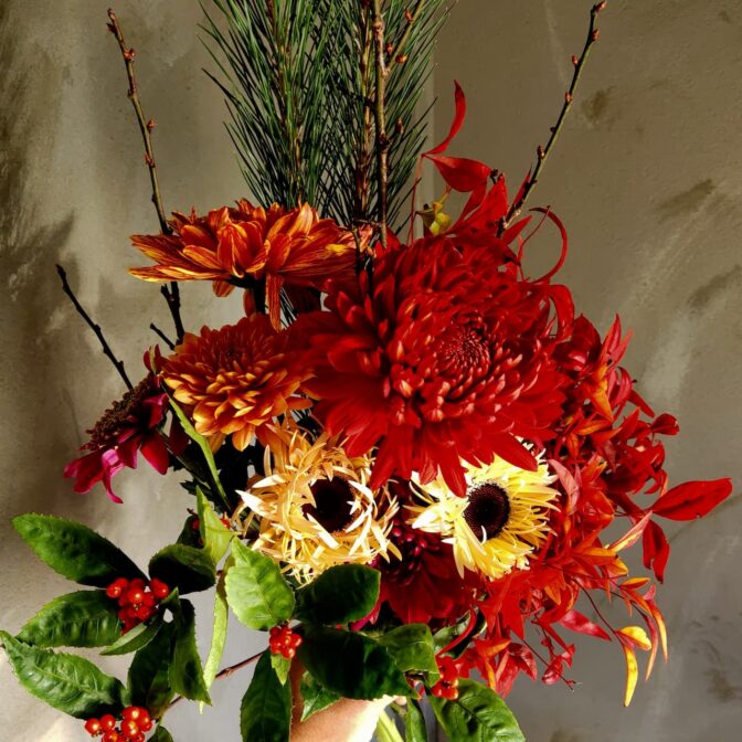 自家栽培のカラーやガーベラ、季節の洋花を組み合わせた、縁起よくおしゃれなお花です。