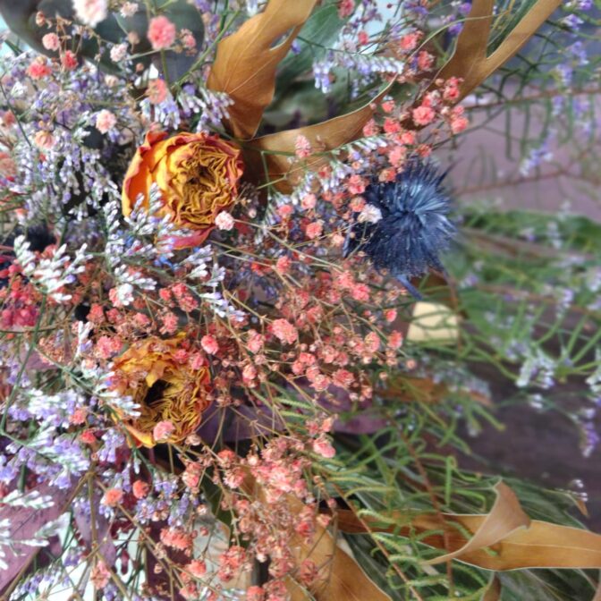 ニュアンスたっぷりのドライフラワーを束ねると、生花とはまた違った雰囲気を楽しめる素敵なスワッグに。